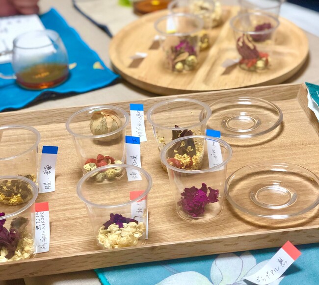 その後、渡辺シェフと文菜華のスタッフのみなさんが、何回もfuachaの事務所を訪れてくださり、fuachaの篠原と一緒に中国茶の茶葉と花のブレンドを数十種類も組み合わせて、納得いくまで試飲を何度も何度も繰り返し、実に開発期間は8ヶ月にもおよびました。