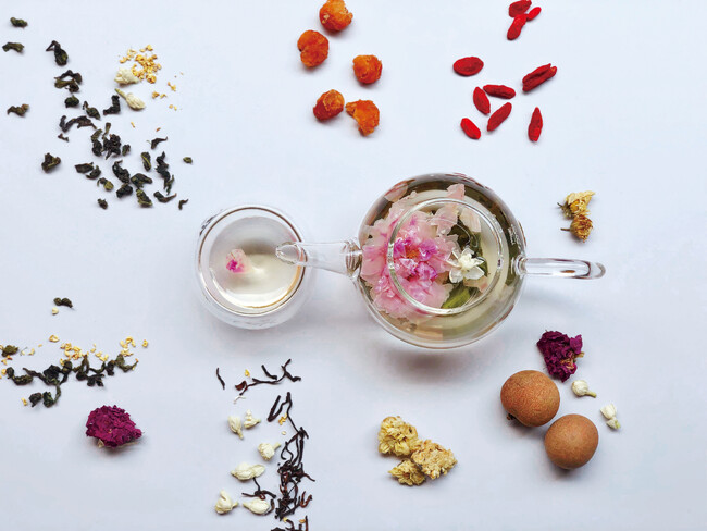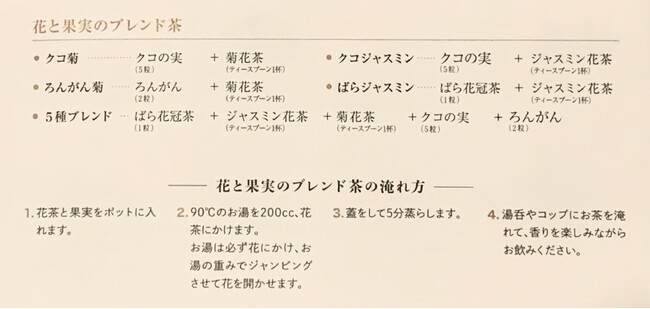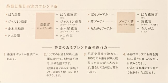 茶葉だけ、あるいは花茶単体でお飲みいただいてもおいしいですが、茶葉・花茶・果実をお好みに合わせてブレンドすると、そのバランスによって甘味や香り、味わいが変化して、多様なバリエーションのお茶を楽しむことができます。