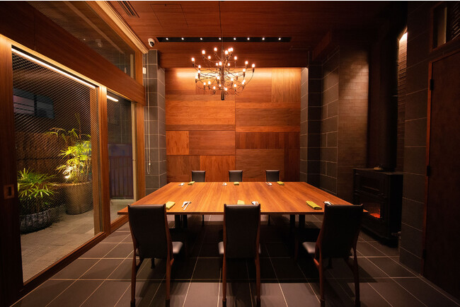 4階個室は、開放感あふれる「プライベートルーム」。パノラマティックに広がるプライベートバルコニーや、木目を活かした美しい壁面。そして軽井沢のストーブ職人が文菜華のために設計&手打ち作業で仕上げた特注アイアン薪ストーブなど、ラグジュアリーな空間が広がります。