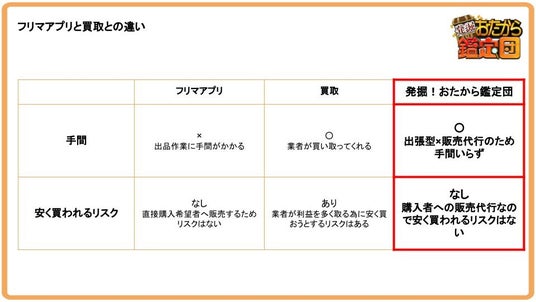 「発掘!おたから鑑定団」は、ご自身で出品作業(商品の撮影、交渉手続き、梱包・発送作業など)を実施するフリマアプリと、一度商品を買取った後に再販を行う買取業者の、中間的な立ち位置と捉えています。