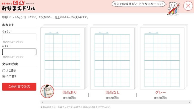 発売以来大好評の「凹凸おなまえドリル」のオーダーページに、仕上がりの印刷イメージをプレビューできる機能を追加し、より購入しやすくしました。