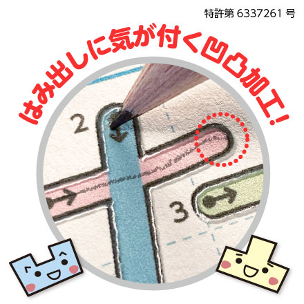 輪郭に凹凸があると、目だけでなく手指の感触でも「はみ出しそう」「はみ出した」という刺激が得られるので自分で気を付けて書くようになります。気を付けて書くようになることで、えんぴつの動きを意識するようになり、徐々に運筆力が身に付いていきます。