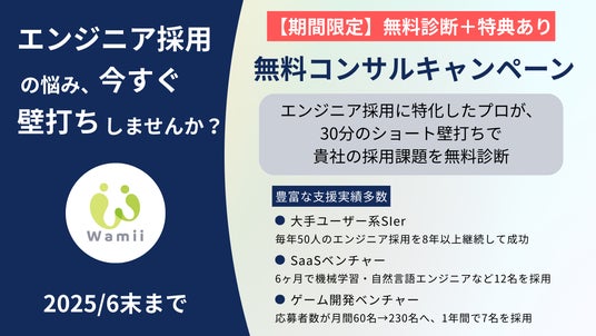ワミィ株式会社(本社:東京都渋谷区、代表取締役 伊藤和歌子)は、エンジニア採用に課題を抱える企業様向けに、2025年6月末までの期間限定で「無料お試しコンサルティング」キャンペーンを実施します。