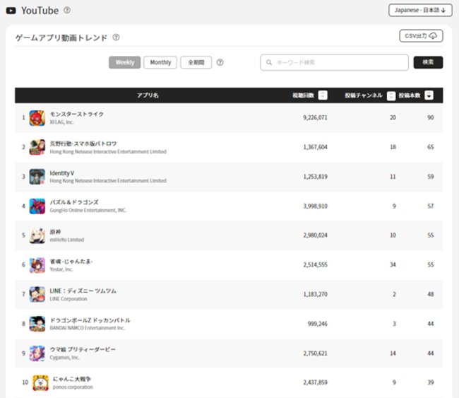 当該期間ではモンスターストライクが投稿チャンネル数20、投稿本数90本で1位の結果となった。