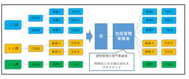 包括管理業務委託とは、課ごと、施設ごと、業務ごとに契約している保守点検や清掃等、様々な業務委託をひとつに包括した維持管理手法で、複数年にわたり契約する委託のことです。