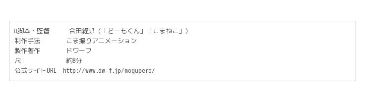 脚本・監督を手掛ける合田経郎(ドワーフ)がこの作品に込めた思いは、「日々めまぐるしく動くこの世の中で、おいしいごはんを料理し一緒に食べる幸せが伝わるお話をこどもたちに届けたい」というもの。色とりどりのちょっと不思議な食材をモーグが手際よく調理するシーンや小さなぺロルが一心不乱にご飯を食べるシーンなど、一コマ一コマに気持ちを込めてドワーフで撮影しました。