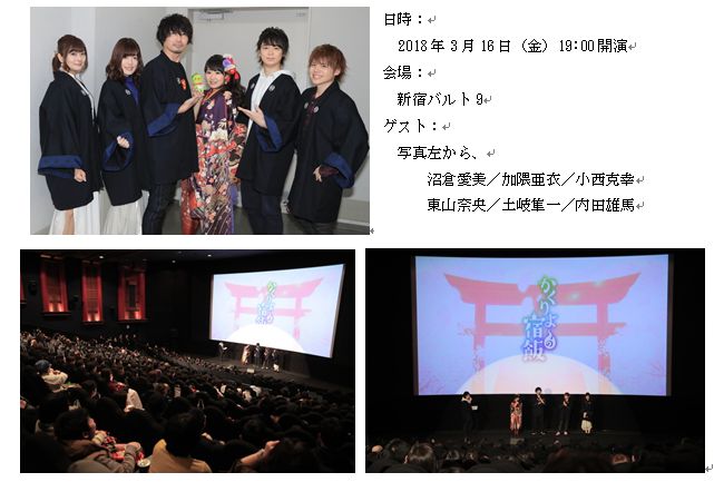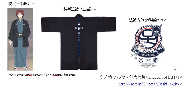 また、2018年3月16日(金)に新宿バルト9で開催された先行上映会では、この「宝祭堂」で企画製造販売する「かくりよの宿飯」オフィシャルグッズの一商品である、“日本の粋”を現代に発信するアパレルブランド「火消魂(HIKESHI SPIRIT)」とのコラボレーションにて、作中の登場人物「暁(土蜘蛛)」が羽織る法被を忠実に再現した特製法被「天神屋従業員はっぴ」を、各キャラクターの声優やテーマ曲を歌うアーティストに着用いただき、先行上映会に参加した放映を待ち望む約500名のファンの皆様へ、舞台上から商品のお披露目をいたしました。