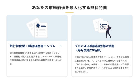 『Bankers career(バンカーズキャリア)』は、変化の激しい銀行業界でキャリアチェンジを考える銀行員の方々を支援するため2つの無料特典をご用意。銀行業務の専門性を最大限にアピールできる20種類の銀行員専用職務経歴書テンプレートと、経験豊富なプロフェッショナルによる無料の職務経歴書添削サービス(毎月先着20名様限定)を提供します。