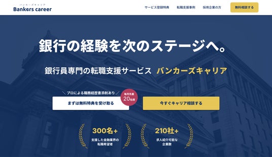 このような課題を解決し、銀行員一人ひとりが持つ貴重な経験とスキルを最大限に活かせるキャリアチェンジを実現するため、銀行業務を深く理解した、銀行員に特化した転職支援サービス『Bankers career(バンカーズキャリア)』を開発いたしました。
