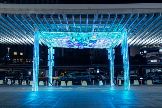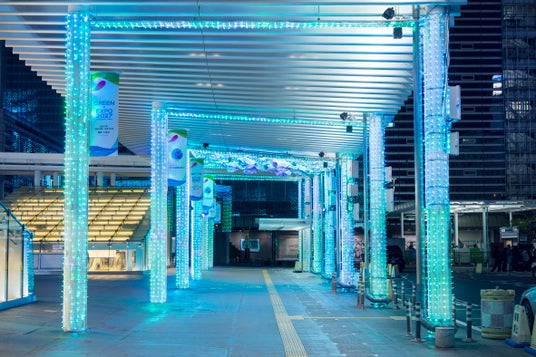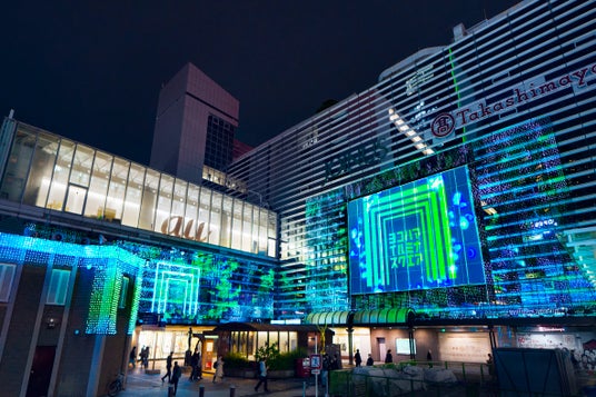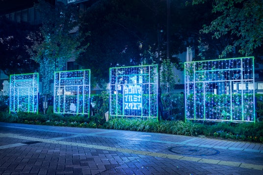 使用発光体総数は約11万球、ネオンチューブライトの総延長は約900 メートルにおよび、さらに2027年国際園芸博覧会(GREEN×EXPO 2027)開催を1 年後にひかえ、“芽生え”をイメージしたブルーグリーンのカラーによる演出をお楽しみいただけます。街全体を包み込むスケールで、人と街が一体となる体験空間を描き出しています。