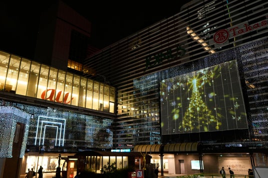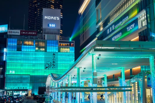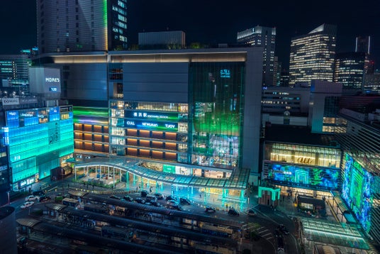 横浜モアーズ壁面:フルカラーLEDによるライティングで鮮やかな色の変化とダイナミックな動きで迫力ある演出を実現