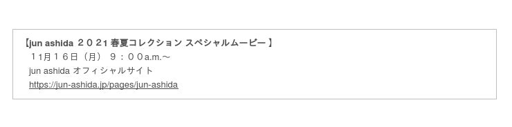 11月16日(月) 9:00a.m.より、「jun ashida 2021 春夏コレクション」の作品を撮り下ろしたスペシャルムービーを弊社オフィシャルサイトにて公開中です。