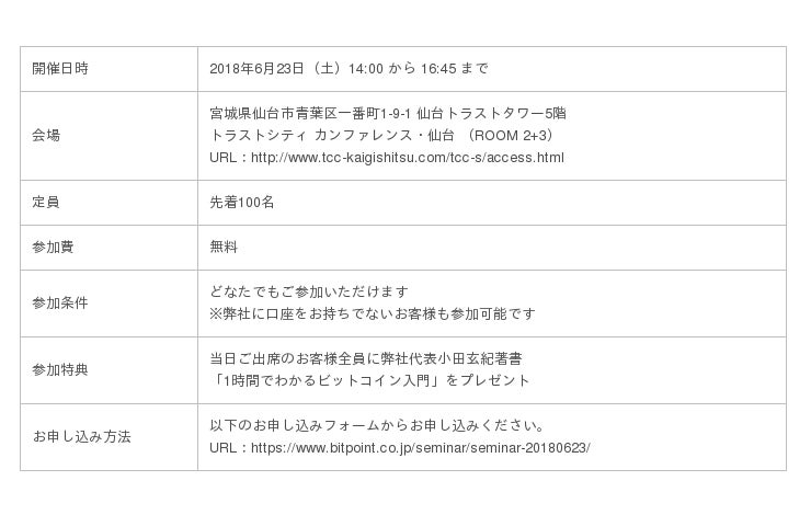 株式会社リミックスポイント(証券コード:3825、本社:東京都港区六本木3丁目2番1号、代表取締役社長 小田玄紀)の子会社である株式会社ビットポイントジャパン(以下「BITPoint」)は、2018年6月23日(土)に、宮城県・仙台において初心者の皆様に向けたセミナーを開催いたします。
