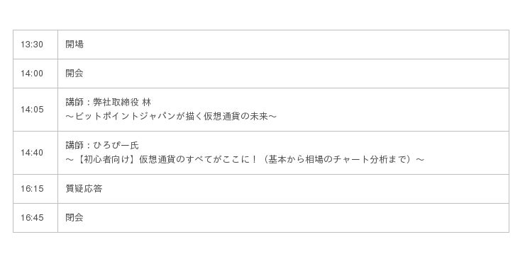 セミナーでは、仮想通貨の投資情報としてコラムを執筆いただいているひろぴー氏による「仮想通貨の基本から、チャート分析を用いた取引まで」、および取締役の林による「ビットポイントジャパンが描く仮想通貨の未来」の2部構成を予定しております。セミナーへのご参加は無料となっておりますので、奮ってお申し込みください。