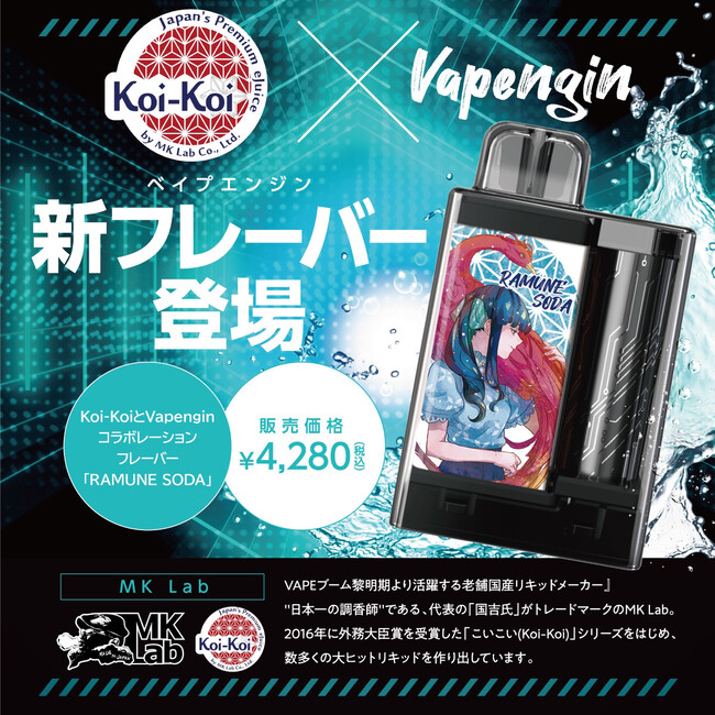 本製品は、日本上陸後わずか2か月で楽天、Amazonランキングで1位を獲得した、持ち運びシーシャ「Vapengin(ベイプエンジン)」と、外務大臣賞を受賞した経歴をもつ老舗国産リキッドブランド「Koi-Koi(こいこい)」のコラボ商品です。