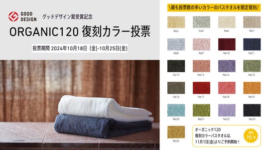 今回の受賞を記念し、過去のアーカイブカラー21色の中から、復刻カラー投票を行います。一番投票数の多かったカラーは、「オーガニック120復刻版バスタオル」として、限定70枚で発売いたします。ぜひ奮ってご参加ください。