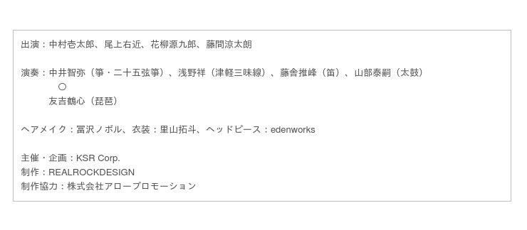 歌舞伎俳優 中村壱太郎、尾上右近の他、日本舞踊家の花柳源九郎、藤間涼太朗が出演。日本の邦楽界で注目を集める演奏家5名が生演奏にて作品を彩る音楽を担当します。さらに、ヘアメイク・衣装には近年のモード・ファッション界の最先端で活躍するクリエイター3名が集結。歴史を超えて受け継がれた表現の中に現代の技術を融合させた、伝統芸能の新たな挑戦は必見です。