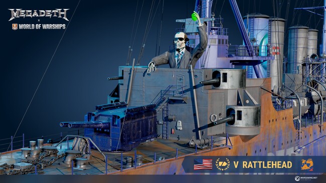 『World of Warships: Legends』でも巡洋艦『Rattlehead』が登場!巡洋艦『Rattlehead』は同じく入手可能なデイヴ・ムステインと『Vic Rattlehead』両方の特別コスチュームを適用できます。またメガデスのロゴやVicの頭をモチーフにしたバッチや記念旗も入手可能、自艦に適用し敵艦に向けてメタル魂を見せつけてやりましょう!