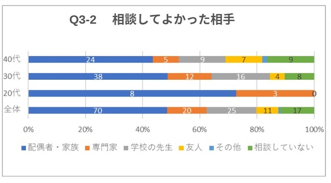 また、「その中で、相談してよかったと思った方はどなたですか?」との問いは、「配偶者・家族」「学校の先生」「専門家」という順に満足度が高いという結果となった。