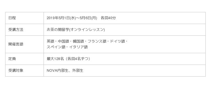 NOVAホールディングス株式会社のグループ会社で英会話事業を行う株式会社 NOVA(本社:東京都港区、代表取締役社長:隈井 恭子)は、2019年5月1日(水)~5月6日(月)のゴールデンウィーク期間限定で、『お茶の間ワールドツアー』を開催致します。