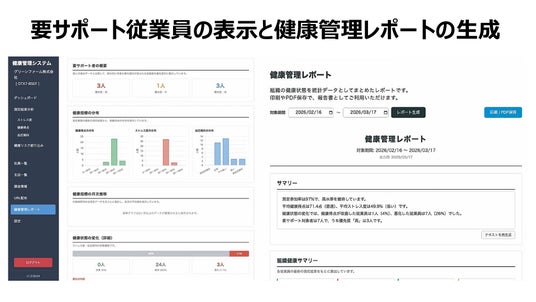 管理者はクラウド上のダッシュボードから、従業員別の健康状態、ストレス傾向、体調変化、組織全体や部門別の健康状態などを確認できます。さらに、蓄積されたデータをもとに健康管理レポートを自動生成し、組織の健康状態の推移や課題を可視化します。