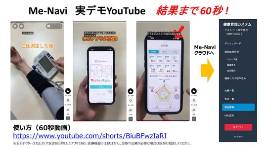 Me-Naviは、血圧と脈拍データを活用し、日々の体調やストレス傾向を可視化する健康管理クラウドサービスです。市販の血圧計とスマートフォンがあれば利用でき、特別な機器は必要ありません。