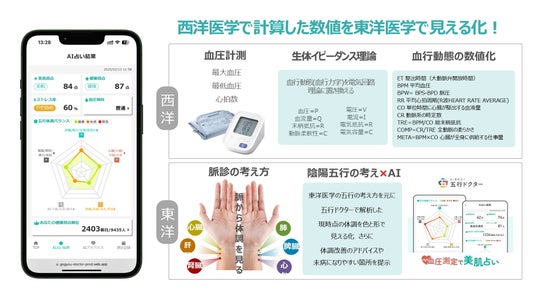 主な機能:健康スコア可視化、血圧傾向分析、ストレス傾向分析、美肌傾向分析、未病/高血圧アラート通知、食事/運動アドバイス、健康・未病ランキング、陰陽五行を使った占い、健康管理レポート生成他