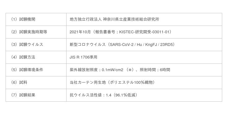 該当商品は、光触媒加工技術である「セリスト(R)」加工を施したファブリックで、既にインフルエンザウイルスに対しては、99%以上の低減効果を確認しています。今般、新型コロナウイルスに対する検証を行い96.1%の低減効果を確認し、また、朝夕の比較的弱い光でも効果を発揮することがわかりました。