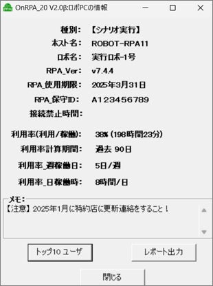 株式会社アクシオ(東京都品川区、代表取締役社長:渡邉 浩司、以下:アクシオ)は、RPA(Robotic Process Automation)専用のリモート実行ツール「OnRPA」に新機能を搭載したOnRPA Ver2.0をリリースします。Ver2.0では、登録されたロボPC*の利用率とTop10ユーザの把握が可能になるため、