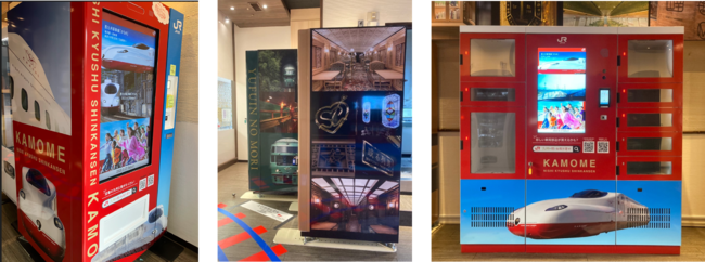 自由販売機(R)に搭載されているサイネージでは現在、JR九州や長崎県のプロモーション動画が流れ、今後はJR九州の西九州新幹線「かもめ」やJR九州のD&S列車の車窓からの景色も放映し、床や壁に施されている様々な装飾と合わせて更に旅行体験ができる空間として参ります。