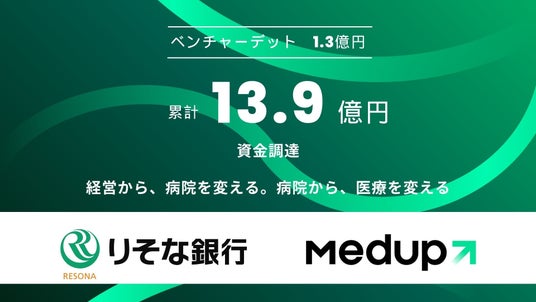 病院経営を改善するためのプロダクトの研究開発および販売を行うメダップ株式会社(本社:東京都港区、代表取締役:柳内健)は、株式会社りそな銀行よりベンチャーデット等による1.3億円の資金調達を実施しました。本調達により、累計資金調達額は13.9億円となりました。