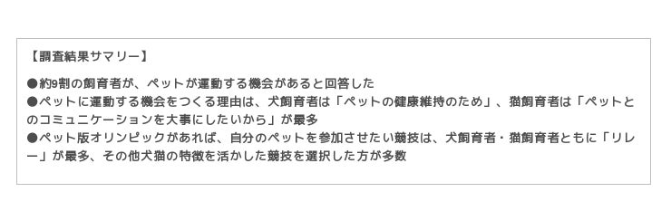 今回の調査では、ペットが運動する機会が「ある」と回答した方は8割を超える結果となり、飼育者は様々な方法で、ペットに運動する機会を作っていることが分かりました。また、ペット版オリンピックがあれば、参加させたい競技は、犬・猫それぞれの特徴を活かせるような競技が選ばれる結果となりました。