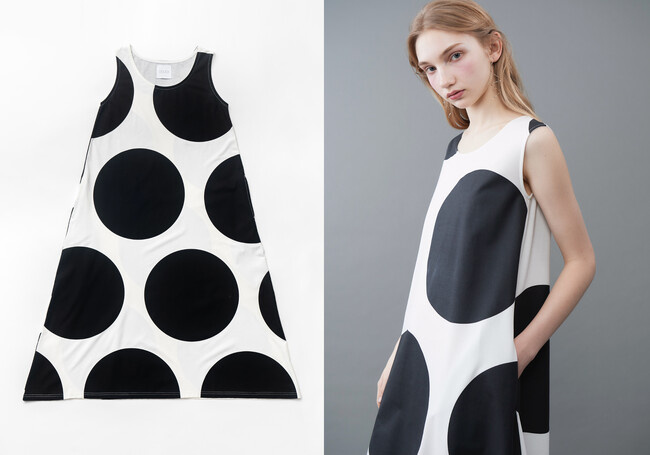 直径12インチの黒いドットを等間隔に配置した、dodot.オリジナルデザインのカットソーワンピースです。左右にポケットが付いています。