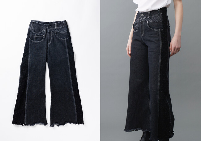 サイドの「穴」がドット柄に見えてくる切り替えデニムパンツ。履き心地の良い柔らかい数種類のデニム生地を使用し、ベルトの切り替え、アシンメトリーなポケット、細かく施したスティッチなど細部にまでこだわったデザイン。裾広がりのワイドシルエットがスタイルをきれいに見せてくれます。