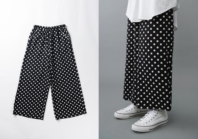 柔らかく滑らかな素材感と履きやすさにこだわった、ドットデザインのワイドパンツ。大小ランダムなドット柄で落ち着いた印象に。