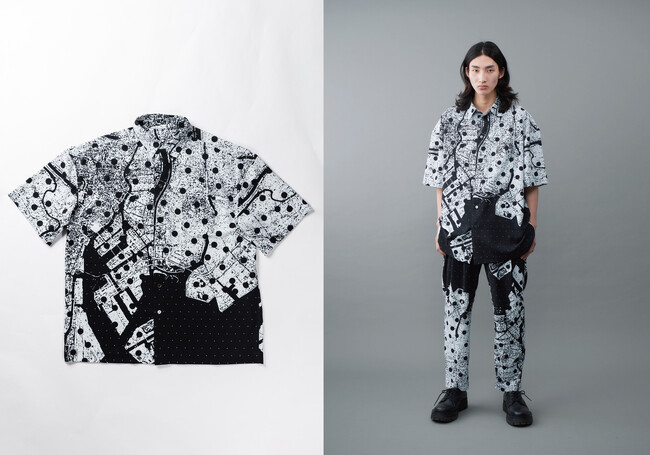 柔らかく肌触りの良い生地にシーズンテーマ「FOCUS」を象徴するグラフィックをプリント。航空写真をモチーフに、遠近によって印象が大きくドット柄の面白さを表現した、セットアップのシャツです。