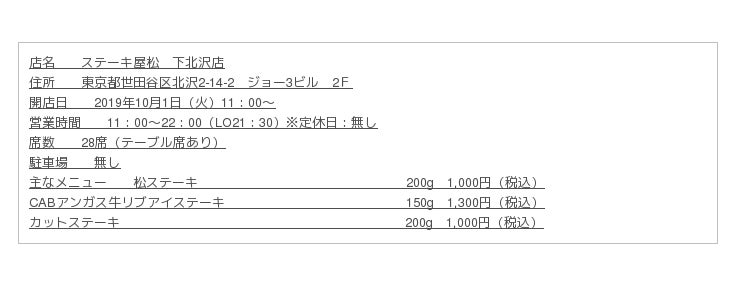 このたび松屋フーズ(本社:東京都武蔵野市、代表取締役社長:瓦葺一利)では、ステーキ業態2号店目となる「ステーキ屋松下北沢店」を小田急線下北沢駅に開店いたしますのでご案内申し上げます。