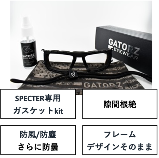 本キットに同梱されている専用ガスケットとアイウェアストラップを、お手持ちのSPECTERに装着いただくことで、顔とサングラスの間の隙間が埋まりゴーグルタイプに近い製品になるため、横風や飛び石が気になるバイク等の運転時、安全上シューティンググラスの着用が認められないサバイバルゲームフィールドにおいても、GATORZ製品の着用が認められる可能性が高くなります。