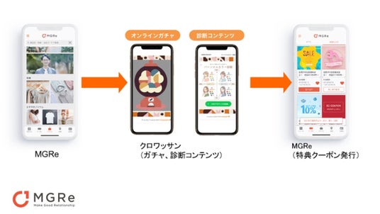 本連携により、MGReで公開したアプリ上にクロワッサンで生成したオンラインガチャや診断コンテンツなどのオリジナルコンテンツを掲載*し、ガチャや診断の結果によりユーザーへのインセンティブをMGReの機能であるクーポンやスタンプとして付与することができるようになります。