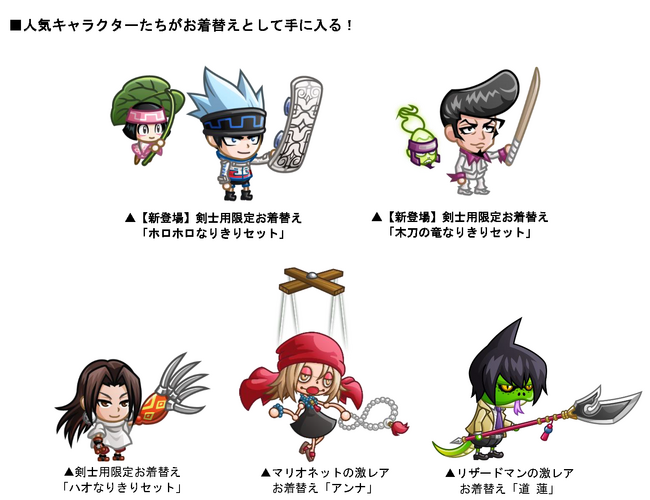 また、剣士用の限定お着替え「ハオなりきりセット」、リザードマンの激レアお着替え「道 蓮」、マリオネットの激レアお着替え「アンナ」のほか、新しく剣士用の限定お着替え「ホロホロなりきりセット」「木刀の竜なりきりセット」も登場しますので、アバたまを割って、コラボ期間中にしか手に入らない限定キャラタマゴやアイテムを手に入れましょう!