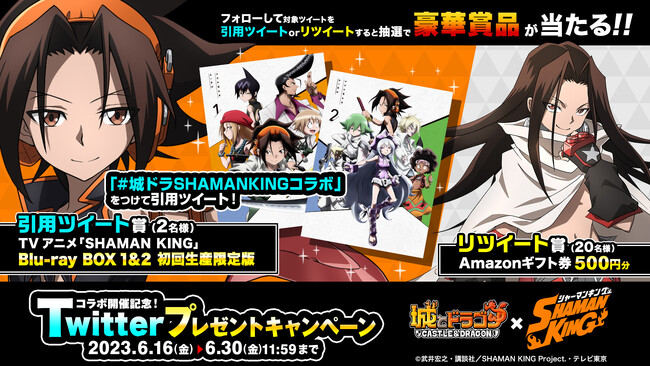 6月16日(金)より「コラボ開催記念!Twitterプレゼントキャンペーン」を実施いたします。『城とドラゴン』公式Twitterアカウントをフォローし、対象ツイートを「#城ドラSHAMANKINGコラボ」をつけて引用ツイート、もしくは、リツイートしていただいた方の中から抽選で、Blu-rayやAmazonギフト券をプレゼント!