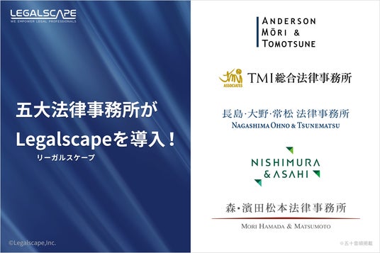 株式会社Legalscape(本社:東京都文京区 代表取締役社長・最高経営責任者 八木田 樹、以下リーガルスケープ)は、リーガルリサーチプラットフォーム「Legalscape(リーガルスケープ)」が五大法律事務所(※)の全てで導入されたことをお知らせします。