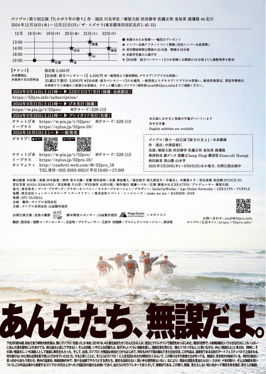 今公演は演劇を通した国際交流、異文化交流を理念に掲げ進んできたゴツプロ!にとっての再出発となり、また日台の演劇界の繋がりが更に強化され発展していく為の大きな一歩になると確信しています。