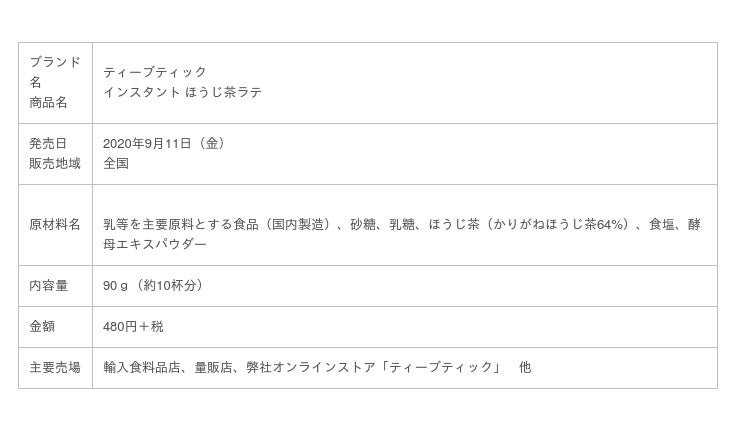 クレイジーソルト、ポンパドール・ハーブティー、茶語(Cha-Yu)、ティーブティックを手がける日本緑茶センター株式会社(本社:東京都渋谷区、代表取締役社長:北島大太朗)は、秋冬の定番ドリンク・ほうじ茶をミルクティーのように手軽に楽しめる「インスタントほうじ茶ラテ」を、好評につき昨年に続いて今年も2020年9月11日(金)に数量限定発売いたします。