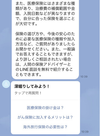 生命保険、損害保険、法人保険など、どんな保険の悩みにも対応可能な会話AIです。