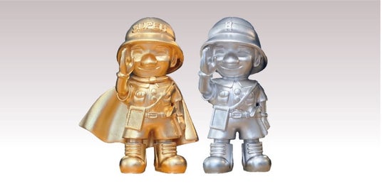 注目は、金(18K)のスーパーヒトシ君人形と銀(SV925)のヒトシ君人形フィギュアです。実物ヒトシ君人形の約1/3サイズの金銀フィギュア(シリアルNo.入り)は完全受注生産販売で、展覧会会場にて購入申込ができます。