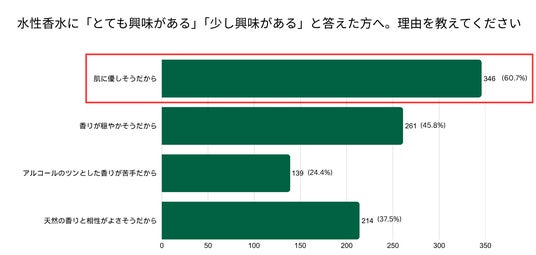 アルコールを含まない水性香水は、刺激に敏感な人やアルコールアレルギーを持つ人に一定の支持があると言われています。アンケートでは「肌にやさしいから」という理由で興味を持った人が6割を超え、従来の香水にないニーズが顕在化しました。