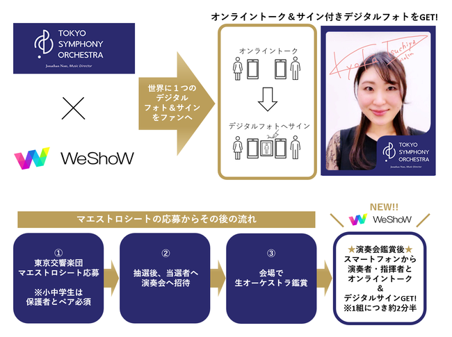 この度、東京交響楽団とWeShoWは共同で、小学生・中学生・高校生(19歳未満全ての青年)を対象とした奏会招待&交流企画「マエストロシート」において、双方向型ライブ配信技術を活用し、オンライントークとオリジナルサイン付きデジタルフォトをプレゼントするかたちにリニューアルいたしました。
