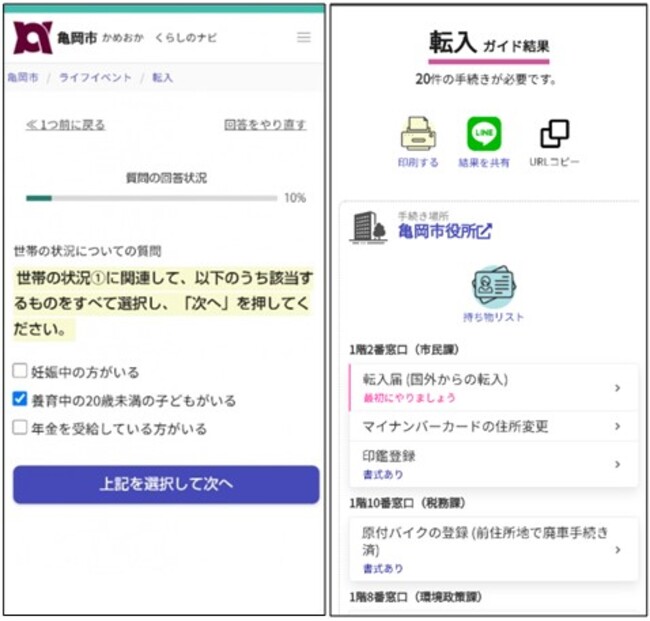 今回導入した「かめおか くらしのナビ」は、インターネットから24時間365日、最大20問程度の質問に答えるだけで自分に必要な手続き、窓口、持ち物等を簡単に調べることができます。