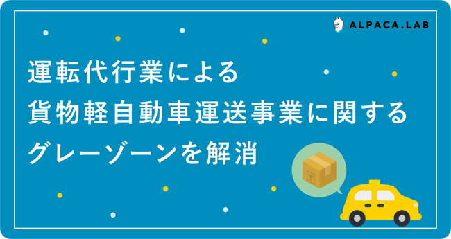 株式会社Alpaca.Lab(所在地:沖縄県中城村、代表取締役:棚原 生磨)は、以前より実証実験*1を繰り返していた運転代行業による貨物軽自動車運送事業について、グレーゾーン解消制度を活用し「荷物の配送を運転代行業務の空車状態時及び実車状態時のいずれも行うことが、貨物自動車運送事業法や道路運送法に抵触しない」との回答*を受けたことをお知らせします。